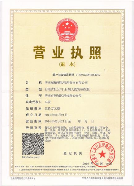 瑞糧餐飲總部設(shè)在濟(jì)南,辦公面積 4000 余㎡,瑞糧餐飲是一家集酒店管理咨詢、餐飲連鎖經(jīng)營、大型商業(yè)運(yùn)營為一體的綜合型企業(yè)。公司旗下現(xiàn)有漁江情緣、九蒸一飯、包祖、蜀辣先鋒、牧果多客、思麥龍、妙拉、板司丸等多個(gè)品牌項(xiàng)目,以山東為運(yùn)營中心,輻射全國各省市。公司自成立以來以誠信經(jīng)營為基礎(chǔ),以客戶滿意為保證,著力打造品牌餐飲文化,公司下設(shè):研發(fā)服務(wù)中心、招商加盟中心、運(yùn)營服務(wù)中心、配送服務(wù)中心、網(wǎng)絡(luò)信息中心、培訓(xùn)服務(wù)中心、策劃服務(wù)中心、人力行政中心、財(cái)務(wù)審計(jì)中心等九大管理服務(wù)中心,致力于做中國最值得信賴的餐飲運(yùn)營服務(wù)商,打造中國頂級(jí)的餐飲創(chuàng)業(yè)服務(wù)品牌。瑞糧人憑借對(duì)社會(huì)的使命感和對(duì)產(chǎn)品的完美追求,旗下品牌獲得了廣大客戶的普遍贊譽(yù)。