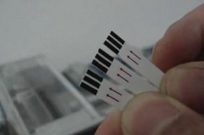 血糖試紙是與血糖檢測(cè)儀配套使用的、涂有生物酶,可通過(guò)其顏色變化檢驗(yàn)?zāi)┥已心称咸烟谴嬖诹康囊活惡牟摹? 試紙涂有一層超薄的導(dǎo)電層(常用的有黃金),通過(guò)激光的打磨變成錯(cuò)綜復(fù)雜的電路。在另一個(gè)機(jī)器里,會(huì)在試紙末端涂上化學(xué)涂層(里面含有葡萄糖氧化酶或葡萄糖脫氫酶)。這種生物化學(xué)混合物的作用是與測(cè)試者血液中的葡萄糖反應(yīng)產(chǎn)生電流。試紙條干燥后,就要到另一臺(tái)機(jī)器上去開辟接納血液樣本的軌道。目前市面上常見(jiàn)的血糖試紙有的是頂端吸血,有的是兩側(cè)吸血,還有的是表面涂血。就是因?yàn)樵谥谱鲿r(shí)所開的軌道不同。最后把制作好的試紙條帶切割成單獨(dú)的小試紙條密封好,使它們免受濕氣和氧化,影響檢測(cè)結(jié)果。