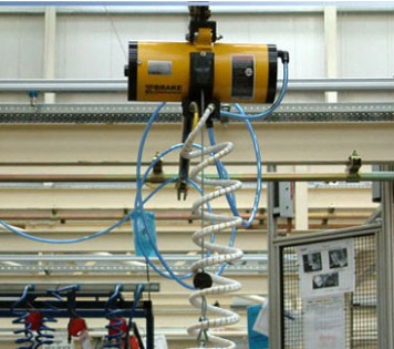 氣動平衡器是利用氣體動力學原理,實現(xiàn)物體的無重力狀態(tài)的機器,氣動平衡器具有平衡物料重力的功能。氣動控制系統(tǒng)在氣源正常給氣的情況下,氣控換向閥處于接通狀態(tài)。當空載起重時,氣體依次經(jīng)過氣源、過濾器、匯流板到達空載平衡減壓閥、梭動閥,最后到達執(zhí)行氣缸。執(zhí)行氣缸內的氣體壓力通過空載平衡減壓閥控制。與此同時,氣壓到達微型儲氣罐、彈簧復位式換向閥、單向節(jié)流閥。