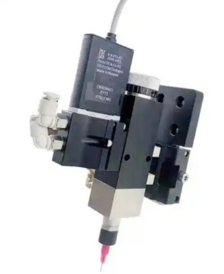 根據(jù)點(diǎn)膠原理不同,點(diǎn)膠技術(shù)大致可分為接觸式點(diǎn)膠和無接觸式點(diǎn)膠,如圖所示。接觸式點(diǎn)膠依靠點(diǎn)膠針頭引導(dǎo)膠液與基板接觸,延時(shí)一段時(shí)間使膠液浸潤基板,然后點(diǎn)膠針頭向上運(yùn)動(dòng),膠液依靠和基板之間的黏性力與點(diǎn)膠針頭分離,從而在基板上形成膠點(diǎn)。這項(xiàng)點(diǎn)膠技術(shù)的最大特點(diǎn)是需要配置高精度的高度傳感器,以準(zhǔn)確控制針頭下降和抬起的高度。無接觸式點(diǎn)膠則以一定方式使膠液受到高壓作用,由此獲得足夠大動(dòng)能后以一定速度噴射到基板上,噴射膠液過程中,針頭無Z 軸方向的位移。