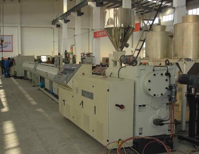 管材生產(chǎn)線由控制系統(tǒng)、擠出機(jī)、機(jī)頭、定型冷卻系統(tǒng)、牽引機(jī)、行星切割裝置及翻料架組成。