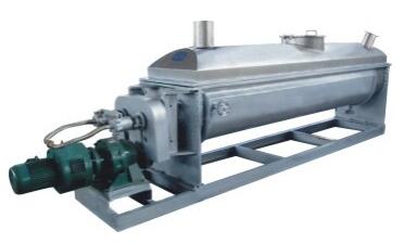 污泥專用干燥機(jī)是一種間接加熱低速攪拌型干燥機(jī)。設(shè)備內(nèi)部有兩根或者四根空心轉(zhuǎn)動軸,空心軸上密集并聯(lián)排列著扇面楔形中空葉片,結(jié)構(gòu)設(shè)計(jì)特殊巧妙。軸體相對轉(zhuǎn)動,利用角速度相同而線速度不同的原理和結(jié)構(gòu)巧妙地達(dá)到了軸體上污泥的自清理作用,最大限度地防止了污泥干化過程中的“抱軸”現(xiàn)象。以最快速度使得污泥在干化過程中迅速沖過“膠粘化相區(qū)域”。同時(shí)巧妙的結(jié)構(gòu)使得污泥在干化過程中達(dá)到了雙向剪切狀態(tài)。被干燥的污泥由螺旋送料機(jī)定量地連續(xù)送入干燥機(jī)的加料口,污泥進(jìn)入器身后,通過槳葉的轉(zhuǎn)動使污泥翻轉(zhuǎn)、攪拌,不斷更新加熱介面,與器身和槳葉接觸,被充分加熱,使污泥所含的表面水分蒸發(fā)。同時(shí),污泥隨槳葉軸的旋轉(zhuǎn)成螺旋軌跡向出料口方向輸送,在輸送中繼續(xù)攪拌,使污泥中滲出的水分繼續(xù)蒸發(fā)。最后,干燥均勻的合格產(chǎn)品由出料口排出。采用夾套式殼體結(jié)構(gòu),使得污泥在機(jī)器內(nèi)部各個(gè)界面均勻受熱,軸體轉(zhuǎn)動,污泥在設(shè)備內(nèi)不段翻騰,受熱面不斷翻新。從而大大提高了設(shè)備的蒸法效率,既達(dá)到了污泥干化的目的,又實(shí)現(xiàn)了整套裝置的低成本運(yùn)行。