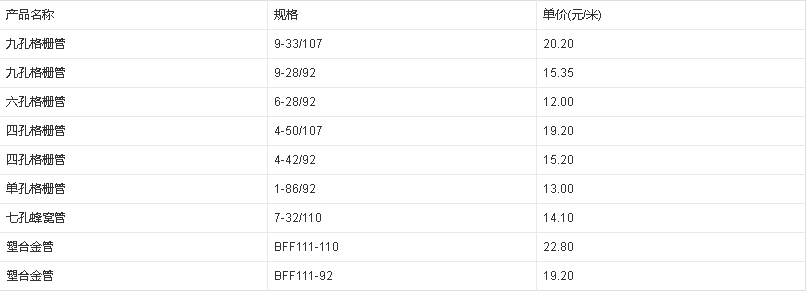 多孔格柵管之所以稱為多孔,是因?yàn)樗卸鄠(gè)孔,多孔格柵管包括有單孔格柵管,四孔格柵管,五孔格柵管,六孔格柵管,九孔格柵管,七孔蜂窩管以及更多孔等各種的格柵管。杭州萬通塑膠有限公司生產(chǎn)的多孔格柵通信直埋管是一種新型光纜護(hù)套管,是集護(hù)套與子管為一體,一次擠壓成型 造型美觀采用PVC工程塑料制作抗壓強(qiáng)度高,重量輕,使用壽命長,內(nèi)壁光滑,磨擦力小,施工方便,可抵抗外力影響保護(hù)光、電纜功能的管子。有效空間大,方便于光纜的穿導(dǎo)、隔離及保護(hù),產(chǎn)品具有提高工效、節(jié)約成本、安裝方便、穩(wěn)妥可靠等明顯優(yōu)點(diǎn)。廣泛適用于光纖通訊、有線電視、電力電纜多媒體傳輸?shù)然A(chǔ)工程,是一種新型實(shí)用的光電通訊設(shè)施的配套產(chǎn)品。