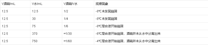 例題:為了分離酒精和水的混合物,張小同學(xué)依據(jù)已學(xué)過(guò)的知識(shí),提出一種方案:依據(jù)水和酒精凝固點(diǎn)不同可將水和酒精分開(kāi)。為此,他利用家中的電冰箱的冷凍室做了如下實(shí)驗(yàn):他將配有不同比例的水和酒精的混合物放入冷凍室中,并用溫度計(jì)監(jiān)測(cè)混合液的溫度,定時(shí)觀察,他所測(cè)數(shù)據(jù)和觀察到的現(xiàn)象如下表: