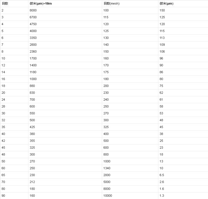 篩網(wǎng)目數(shù)與粒徑(μm)對(duì)照表