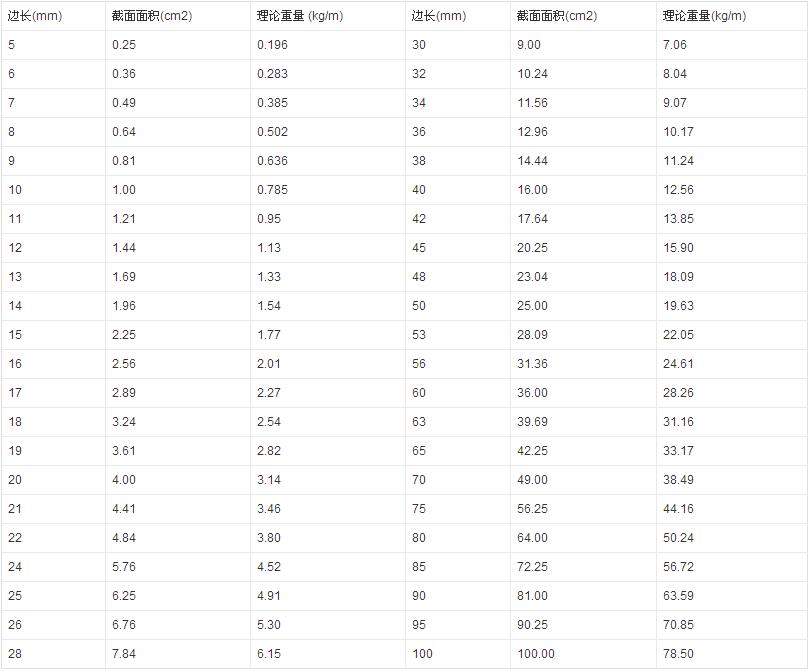 方鋼理論重量計(jì)算公式:邊長(zhǎng)(m)Х邊長(zhǎng)(m)Х7850(kg/m^3)=kg/m