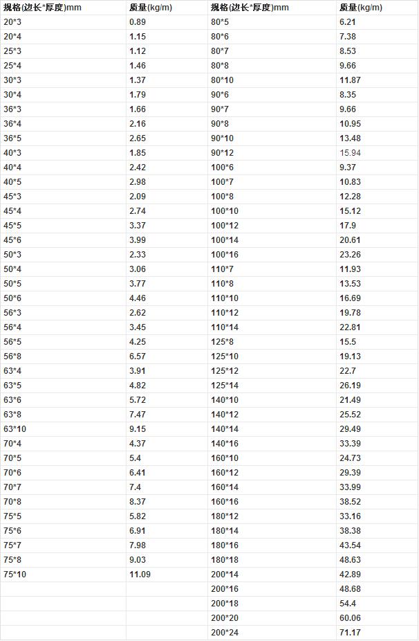 例如50*5角鋼:(50+50-5)*5*0.00785=3.73(此算法只能粗略算出角鋼重量,實(shí)際以五金手冊(cè)為準(zhǔn)!)