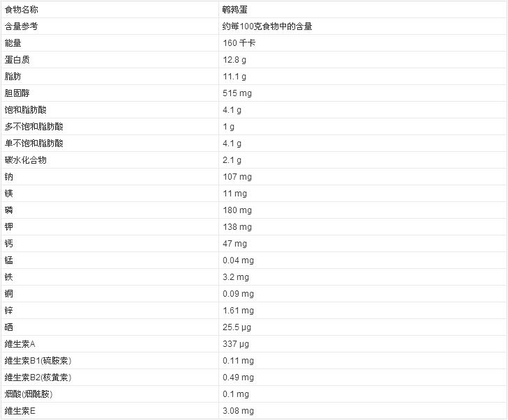 鵪鶉蛋:鵪鶉蛋的營(yíng)養(yǎng)價(jià)值不亞于雞蛋,豐富的蛋白質(zhì)、腦磷脂、卵磷脂、賴(lài)氨酸、胱氨酸、維A、維B2.維B1.鐵、磷、鈣等營(yíng)養(yǎng)物質(zhì),有補(bǔ)益氣血、強(qiáng)身健腦、豐肌澤膚等功效,但應(yīng)該指出的是鵪鶉蛋是禽蛋中膽固醇含量最高的,不可多食。