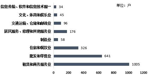 從行業(yè)分布來看,上半年末個(gè)體工商戶在冊(cè)數(shù)量排名前八的行業(yè)分別是租賃和商務(wù)服務(wù)業(yè)、批發(fā)和零售業(yè)、住宿和餐飲業(yè)、制造業(yè)、居民服務(wù)、修理和其他服務(wù)業(yè)、交通運(yùn)輸、倉儲(chǔ)和郵政業(yè)、建筑業(yè)、農(nóng)林牧漁業(yè)。其中,個(gè)體工商戶主要集中分布在租賃和商務(wù)服務(wù)業(yè)、批發(fā)和零售業(yè),其在冊(cè)數(shù)量分別為48640戶和27995戶,占個(gè)體工商戶總數(shù)的比重分別為46.38%、26.69%,究其原因,北侖區(qū)梅山的靈活用工平臺(tái)影響面較大。個(gè)體戶經(jīng)營模式多以傳統(tǒng)服務(wù)業(yè)為主,經(jīng)濟(jì)結(jié)構(gòu)有待創(chuàng)新優(yōu)化。具體情況如圖1-1所示: