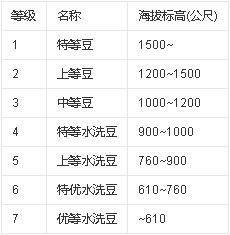 依照栽培地的海拔標(biāo)高,可分三、四、七等各等級(jí)。一般而言,高地豆較低地豆的品質(zhì)佳,而且因運(yùn)費(fèi)增加,價(jià)格也較高。