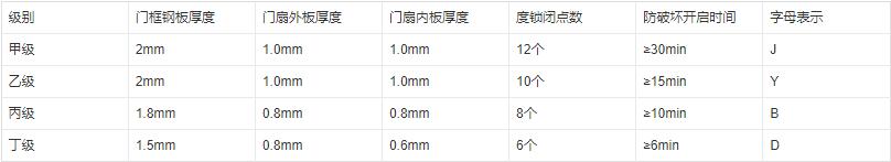 新標(biāo)準(zhǔn)對涉及到防盜門安全性能的條款均為強(qiáng)制性規(guī)定。按防破壞時(shí)間長短、板材厚度等指標(biāo),標(biāo)準(zhǔn)對防盜門產(chǎn)品進(jìn)行了防盜安全等級劃分,新標(biāo)準(zhǔn)將防盜安全級別由原來的"C"、"B"、"A"3級,增至"甲"、"乙"、"丙"、"丁"4級。新的防盜安全級別的拼音字母代號分別為"J"、"Y"、"B"、"D"。甲為最高級,依此遞減。