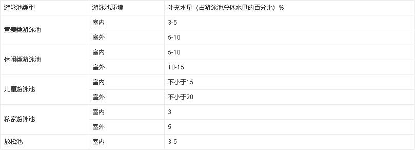 表面蒸發(fā)、池子排污、游泳者帶出池外和過濾設(shè)備反沖洗(如用池水沖洗時等所損耗的水量確定;當資料不完備時.可按下表確定。