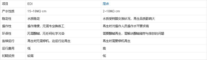 EDI裝置是應(yīng)用在反滲透系統(tǒng)之后,取代傳統(tǒng)的混合離子交換技術(shù)(MB-DI)生產(chǎn)穩(wěn)定的去離子水。EDI技術(shù)與混合離子交換技術(shù)相比有如下優(yōu)點(diǎn):