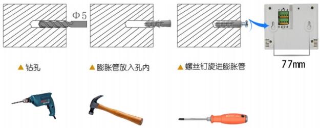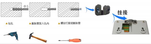 說明:在墻面固定位置打入自攻絲及膨脹螺絲,壁掛方式掛接到葫蘆孔。