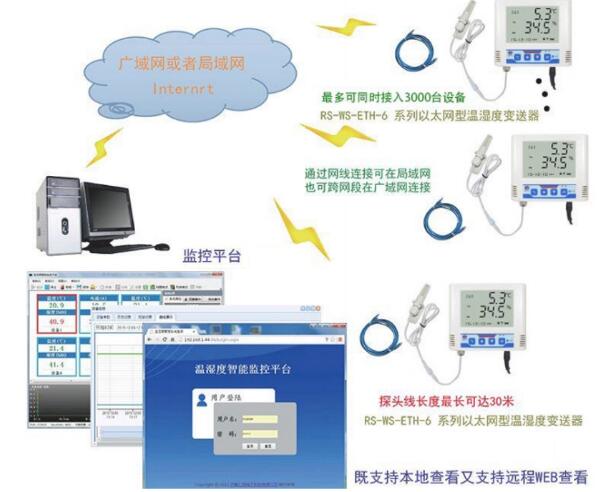 網(wǎng)絡(luò)型溫濕度變送器,可采集溫濕度數(shù)據(jù)并通過以太網(wǎng)/WiFi/GPRS方式上傳到服務(wù)器。充分利用已架設(shè)好的通訊網(wǎng)絡(luò)實(shí)現(xiàn)遠(yuǎn)距離的數(shù)據(jù)采集和傳輸,實(shí)現(xiàn)溫濕度數(shù)據(jù)的集中監(jiān)控。可大大減少施工量,提高施工效率和維護(hù)成本。