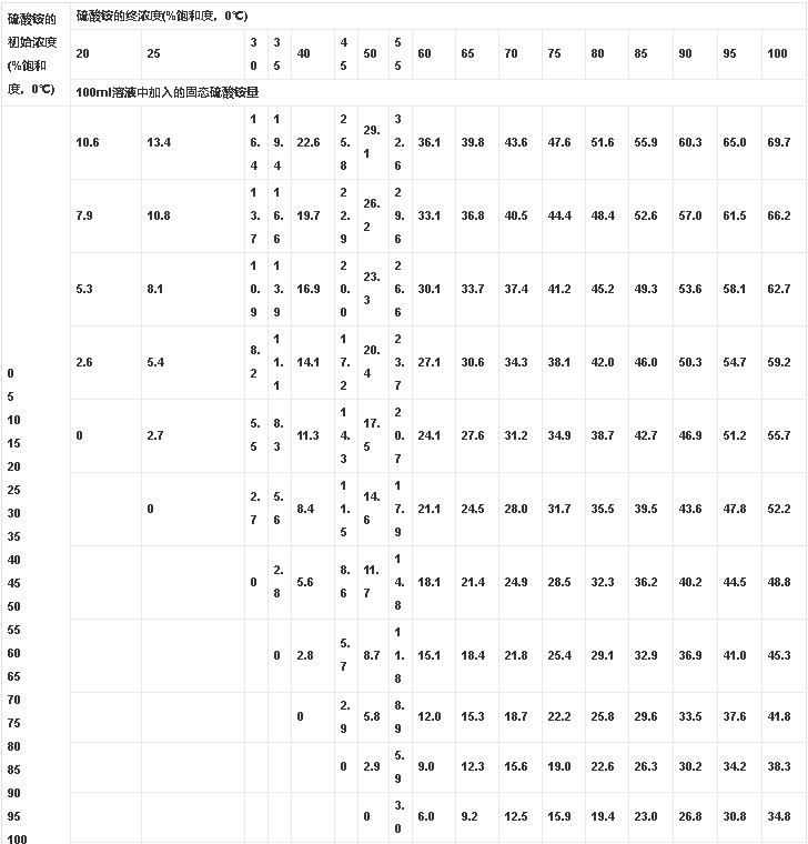 生物學上的用途也很多,多用于蛋白純化工藝方面,因為硫酸銨屬于惰性物質(zhì),不易與其他生物活性物質(zhì)發(fā)生反應,在純化過程中能最大程度的保護蛋白活性,另外,硫酸銨的可溶性極好,能形成高鹽環(huán)境,對于蛋白沉淀與后續(xù)的高鹽純化做準備。硫酸銨在零度與常溫25度的溶解度有較大區(qū)別,以下是硫酸銨在兩個溫度下不同飽和度的摩爾濃度。