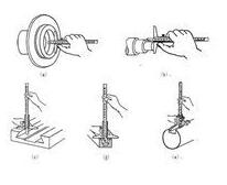 測量時,先把測量基座輕輕壓在工件的基準面上,兩個端面必須接觸工件的基準面,如下圖(a) 所示。測量軸類等臺階時,測量基座的端面一定要壓緊在基準面,下圖(b)(c) 所示,再移動尺身,直到尺身的端面接觸到工件的量面(臺階面)上,然后用緊固螺釘固定尺框,提起卡尺,讀出深度尺寸。多臺階小直徑的內(nèi)孔深度測量,要注意尺身的端面是否在要測量的臺階上,下圖(d)所示 。當基準面是曲線時,如下圖(e) ,測量基座的端面必須放在曲線的最高點上,測量出的深度尺寸才是工件的實際尺寸,否則會出現(xiàn)測量誤差。