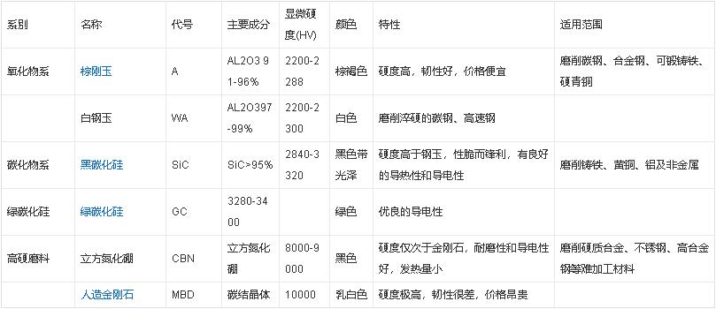磨料是制造砂輪的主要原料,它擔(dān)負(fù)著切削工作。因此,磨料必須鋒利,并具備高的硬度、良好的耐熱性和一定的韌性。常用磨料的名稱、代號(hào)、特性和用途見表1。