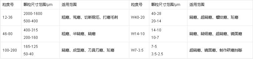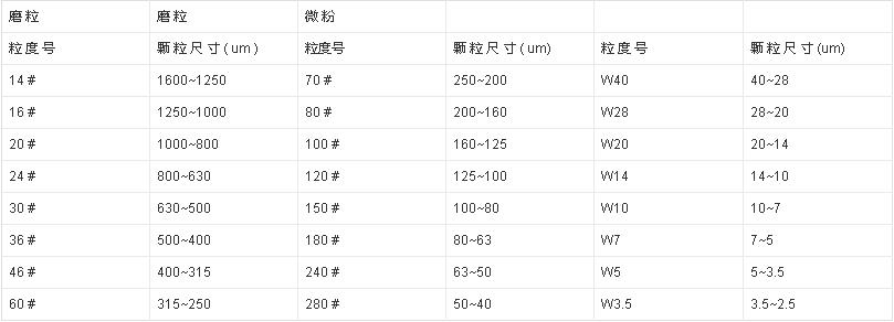 磨料粒度:分 16 、 20 、 24 、 30 、 36 、 40 、 46 、 54 、 60 、 70 、 80 、 90 、 100 、 120 、 150 、 180 、 220 .240(以細(xì)稱為微粉)