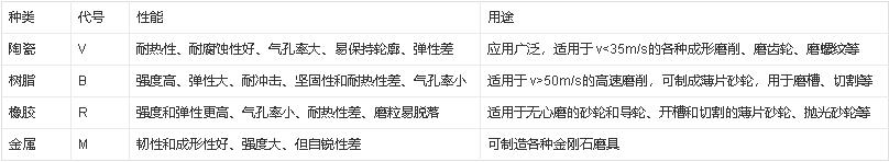 砂輪中用以粘結(jié)磨料的物質(zhì)稱結(jié)合劑。砂輪的強(qiáng)度、抗沖擊性、耐熱性及抗腐蝕能力主要決定于結(jié)合劑的性能。常用的結(jié)合劑種類、性能及用途見表4。