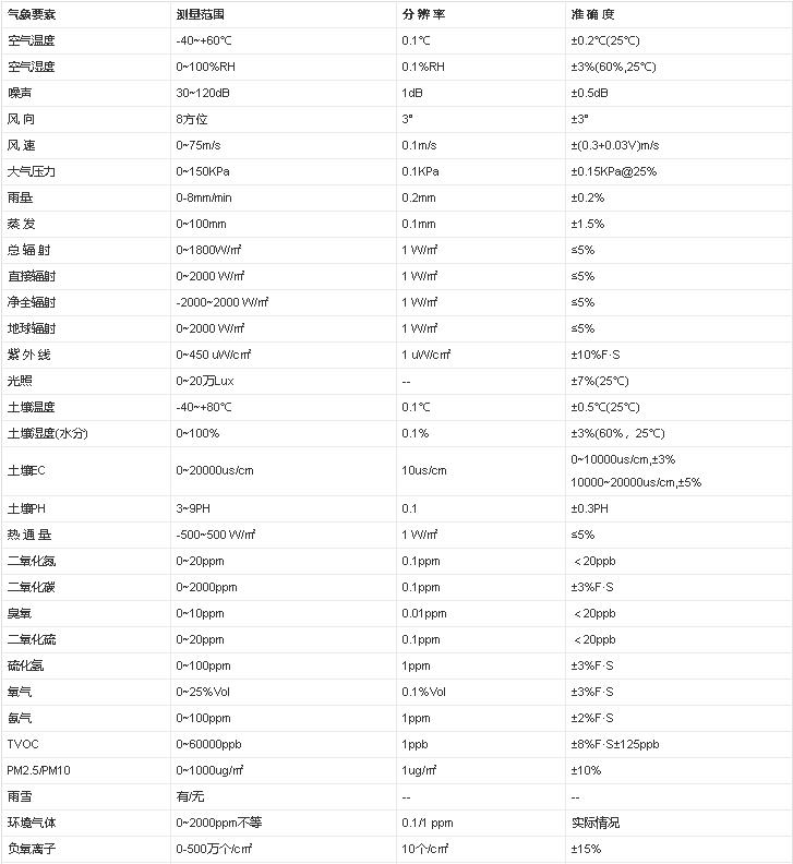 氣象監(jiān)測的內(nèi)容主要包括風(fēng)速、風(fēng)向、土壤溫度、土壤水分、土壤EC、土壤PH、空氣溫度、空氣濕度、噪聲、二氧化碳、大氣壓力、光照、雨雪狀態(tài)、紫外線、總輻射、一氧化碳、臭氧、二氧化氮、二氧化硫、硫化氫、氧氣、PM2.5、PM10、負(fù)氧離子、氨氣、TVOC、雨量、土壤氮磷鉀等二十八種氣象要素。