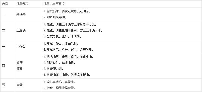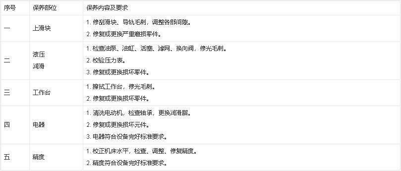 1、機(jī)床運(yùn)行5000小時(shí)進(jìn)行二級(jí)保養(yǎng), 以維修工人為主,操作工人參加,除執(zhí)行一級(jí)保養(yǎng)內(nèi)容及要求外,應(yīng)做好下列工作,并測(cè)繪易損件,提出備品配件。