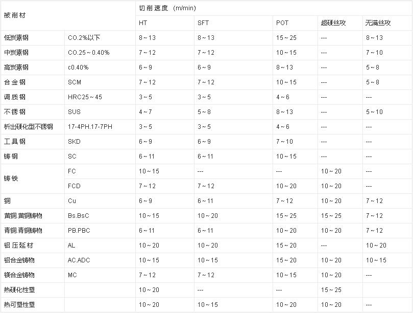 10、機(jī)攻時(shí)的切削速度,一般鋼料為6-15米/分;調(diào)質(zhì)鋼或較硬的鋼料為5-10米/分;不銹鋼為2-7米/分;鑄鐵為8-10米/分。在同樣材料時(shí),絲錐直徑小取較高值,絲錐直徑大取較低值。
