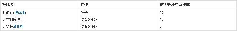 有機(jī)膨潤土在我國已生產(chǎn)、應(yīng)用三十多年,廣泛用于工業(yè)涂料和脫模劑的生產(chǎn),有機(jī)膨潤土是工業(yè)涂料的懸浮劑、增稠劑。具體使用方法是:先將有機(jī)膨潤土做成有機(jī)膨潤土膏(或稱有機(jī)膨潤土凝膠),再用有機(jī)膨潤土膏做涂料和脫模劑,有機(jī)膨潤土膏制造工藝如下表所示:(采用高速分散機(jī))