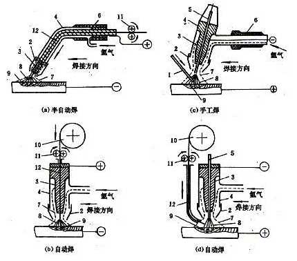 7-氬氣流 8-焊接電弧 9-金屬熔池 10-焊絲盤 11-送絲機構(gòu) 12-焊絲