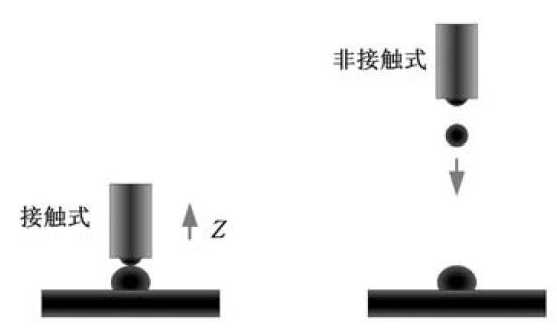根據(jù)點膠原理不同,點膠技術(shù)大致可分為接觸式點膠和無接觸式點膠,如圖所示。接觸式點膠依靠點膠針頭引導(dǎo)膠液與基板接觸,延時一段時間使膠液浸潤基板,然后點膠針頭向上運(yùn)動,膠液依靠和基板之間的黏性力與點膠針頭分離,從而在基板上形成膠點。這項點膠技術(shù)的最大特點是需要配置高精度的高度傳感器,以準(zhǔn)確控制針頭下降和抬起的高度。無接觸式點膠則以一定方式使膠液受到高壓作用,由此獲得足夠大動能后以一定速度噴射到基板上,噴射膠液過程中,針頭無Z 軸方向的位移。
