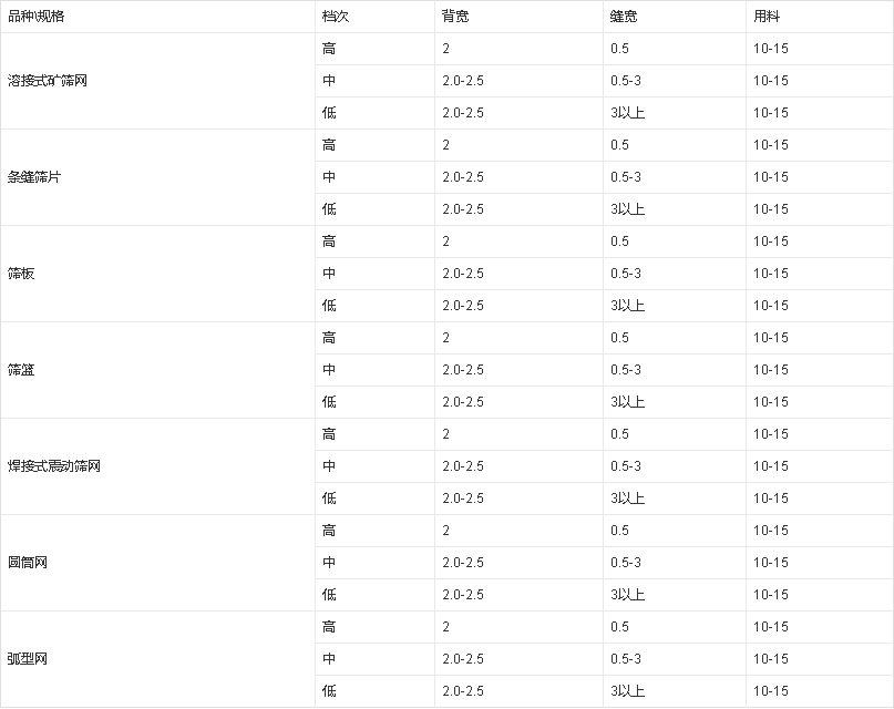 不銹鋼焊接式礦篩網(wǎng)、篩板篩籃、 震動篩網(wǎng)、條縫篩片、圓筒網(wǎng)、弧形篩異性絲網(wǎng)、高強度篩網(wǎng)、聚酯礦篩網(wǎng)等。