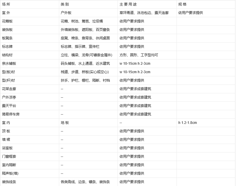 表1木塑復(fù)合材料主要使用場(chǎng)所及用途