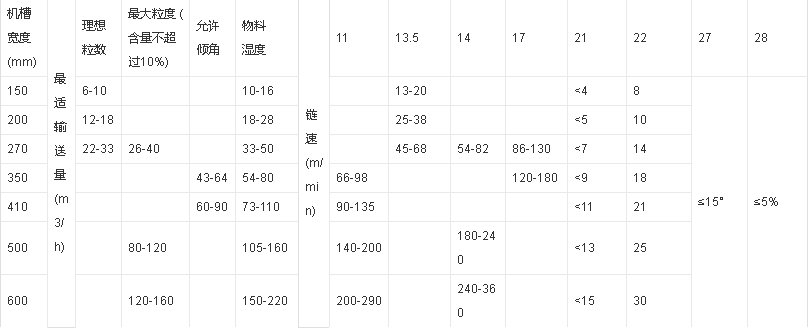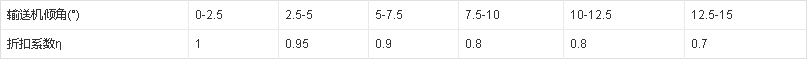 當(dāng)輸送機(jī)傾斜向上運(yùn)行布置時(shí)(即進(jìn)料端在下方,出料端在上方),其輸送能力將有所減少。此時(shí)輸送機(jī)的輸送能力應(yīng)按下表乘以折扣系數(shù)η: