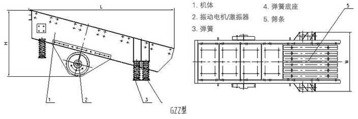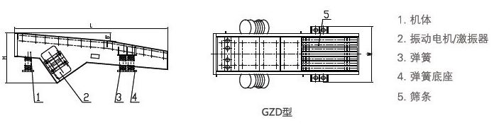 GZD型振動(dòng)給料機(jī)主要由振動(dòng)機(jī)架、振動(dòng)電動(dòng)機(jī)、彈簧、支承座及耐磨襯板等組成。由于振動(dòng)電動(dòng)機(jī)的啟動(dòng),使機(jī)架在支承彈簧上作強(qiáng)制振動(dòng),物料則以此振動(dòng)為動(dòng)力,在料槽上作滑動(dòng)及拋擲運(yùn)動(dòng),從而使物料前移而達(dá)到給料目的。