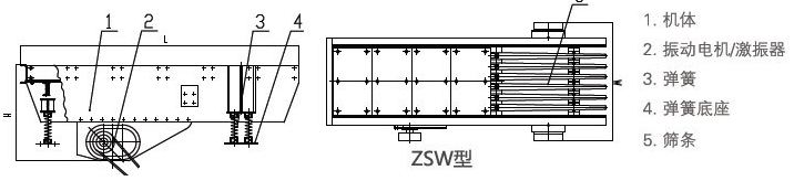 ZSW型振動(dòng)給料機(jī)主要由振動(dòng)機(jī)架、彈簧、振動(dòng)器、電機(jī)振動(dòng)架及電機(jī)等組成。激振器個(gè)是由二特定位置的偏心軸以齒輪相嚙合組成,裝配時(shí)必須使兩齒輪按標(biāo)記相嚙合,通過電機(jī)驅(qū)動(dòng),使兩偏心軸旋轉(zhuǎn),從而產(chǎn)生巨大合成的直線激振力,使機(jī)體在支承彈簧上作強(qiáng)制振動(dòng),物料則以此振動(dòng)為動(dòng)力,在料槽上作滑動(dòng)及拋擲運(yùn)動(dòng),從而使物料前移而達(dá)到給料目的。當(dāng)物料通過槽體上的篩條時(shí),較小的料可通過篩條間隙而落下,可不經(jīng)過下道的破碎工序,起了篩分的效果。