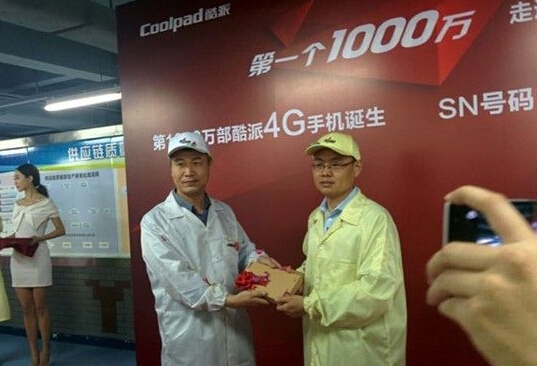 5月24日中午12點半左右,酷派東莞工廠廠長葛總親手將包裝上紫色彩帶的第1000萬部酷派4G手機交給了酷派集團(tuán)副總裁曹井升,并由后者將這部手機的SN碼填寫在簽名背板上,以為對照。