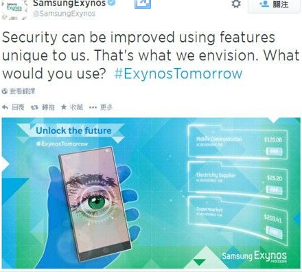7月14日上午消息,三星Exynos推特官方賬號的一則消息以“解鎖未來”為主題,配以一張掃描眼球的示意圖片,似乎暗示即將推出的三星GALAXY Note 4將引入視網膜掃描的功能。