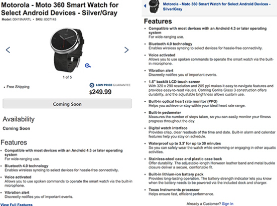 百思買的這個頁面并未披露這款智能手表的發(fā)布日期。但如果內(nèi)容屬實,表明百思買提前兩個星期就泄露了摩托羅拉的新品信息。今年6月在谷歌I/O開發(fā)者大會上展示了一些初步信息后,摩托羅拉宣布將于9月4日在芝加哥正式發(fā)布Moto 360。
