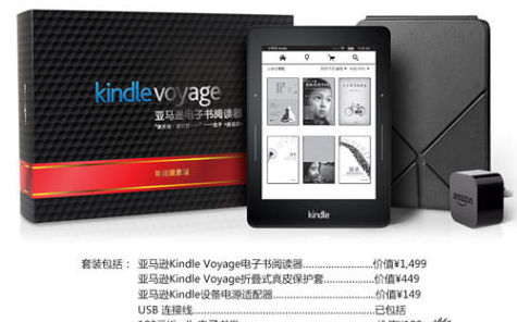 據(jù)亞馬遜官網(wǎng)顯示,Kindle Voyage珍藏限量版包括:Kindle Voyage電子書閱讀器(價值1499元)、折疊式真皮保護套(價值449元)、亞馬遜9W電源適配器(價值149元)、USB連接線以及100元電子書券。