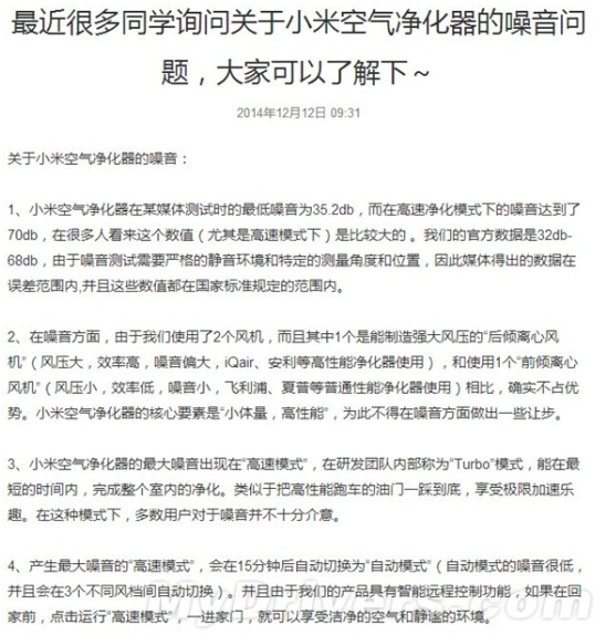 以下為智米對(duì)小米空氣凈化器噪音問題的說(shuō)明全文: