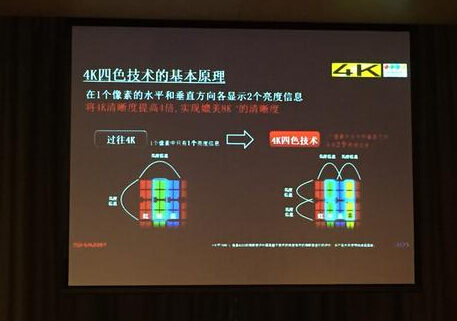 夏普經(jīng)過長期研究表示,液晶面板的清晰度不是取決于像素的個數(shù),而是由亮度信息個數(shù)決定。夏普4K四色技術(shù)正式運用了這一點,人眼對綠色或者黃色等顏色視覺敏感度高,根據(jù)人眼的這一生理特性,傳統(tǒng)三原色面板,一個像素內(nèi)可以感受的亮度信息只有綠色一個像素點也就是一個清晰度。而四色技術(shù)是在傳統(tǒng)三原色基礎(chǔ)上追加黃色,實現(xiàn)一個像素中綠色和黃色2個亮度信息,清晰度提高2倍。因此,4K四色技術(shù)在1個像素中有4個亮度信息,與4K電視相比,清晰度提高了4倍。