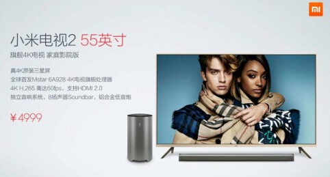 55英寸版小米電視2采用MStar 6A928處理器,Mali-760圖形處理器,2GB運行內(nèi)存和8GB存儲空間,三星4K液晶屏及瑞儀背光模組,牌照合作方則為銀河電視。售價(含Soundbar、無線低音炮)4999元,將于4月8日米粉節(jié)當(dāng)天在小米網(wǎng)免預(yù)約開放購買