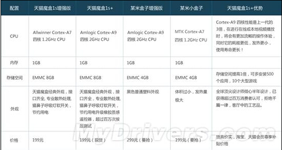 天貓魔盒1S+采用晶晨AML8726-M8四核處理器,Cortex-A9r4架構(gòu),主頻1.9GHz,GPU部分是Mali- 450MP,支持3D、4K輸出,支持3D和4K輸出,內(nèi)存方面則依舊為1G。天貓魔盒官方號稱1S+升級后性能提升300%,支持遠(yuǎn)程視頻通話、雙屏互 動等功能。同時還與友商某米盒子含蓄對比,宣稱天貓魔盒1S+優(yōu)勢明顯。