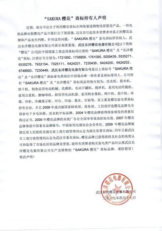 李杰也向記者出示了相關(guān)商標(biāo)注冊證書!拔覀児静攀恰甋AKURA櫻花’及‘東洋櫻花’商標(biāo)家電類別在中國境內(nèi)唯一持有者及商標(biāo)使用人”,李杰強調(diào)到,公司目前經(jīng)營的產(chǎn)品范圍有洗衣機、脫水機、烘干機、制食品用電動機械、洗碟機、電動開罐機、攪拌機、家用電動炸脆機、家用豆?jié){機、磨咖啡機、廚房用電動機器、家用榨水果機、榨汁機、原汁機、冰箱、冷柜、冷藏展示柜、印臺、印油、墨水、牙刷等。