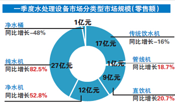 據(jù)第三方調(diào)研公司中怡康日前公布的最新數(shù)據(jù)顯示,一季度,水處理設(shè)備(包含傳統(tǒng)飲水機、凈水桶、直飲機、管線機、純水機和凈水機)市場規(guī)模達67億元,同比增長27.3%。其中,2015年一季度純水機市場規(guī)模已經(jīng)達到27億元,零售額同比增長82.5%;傳統(tǒng)飲水機零售額為17億元,同比下降16%;凈水桶零售額1億元,同比下降48%。
