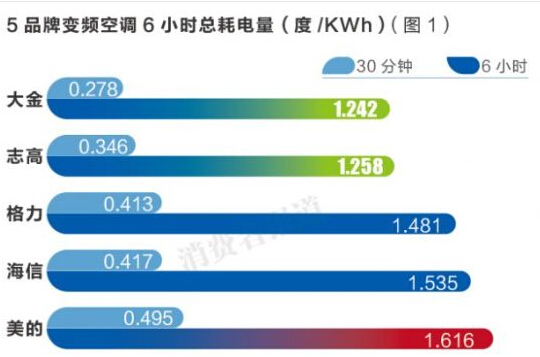結(jié)果顯示,大金、志高空調(diào)在6小時(shí)內(nèi)測試的總耗電量較低,而美的空調(diào)的省電效果相對欠佳。
