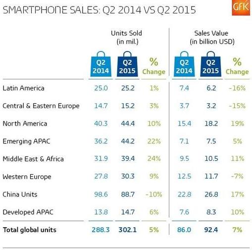 GfK的數(shù)據(jù)顯示,今年第二季度全球智能手機(jī)銷量增長5%,達(dá)到3.021億部。與此同時(shí),智能手機(jī)廠商收入也大幅增加,第二季度達(dá)到924億美元,超過去年同期的860億美元。