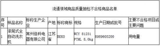 北京時(shí)間8月21日消息,北京市工商局最新公示的流通領(lǐng)域洗衣機(jī)類商品質(zhì)量抽查檢驗(yàn)結(jié)果顯示,標(biāo)稱“常州倍科電器有限公司”生產(chǎn)的“BEKO”牌WCY 81231 PTML 8.0kg規(guī)格滾筒式全自動(dòng)洗衣機(jī)存在質(zhì)量問(wèn)題,主要問(wèn)題為用電量不符合相關(guān)標(biāo)準(zhǔn)的要求。