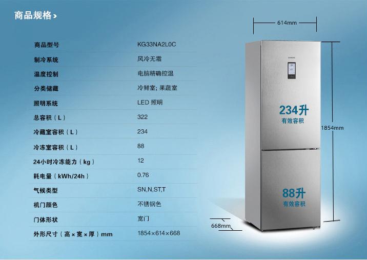 西門子KG33NA2L0C冰箱擁有322升有效容積,其中,冷藏室容積為234升,冷凍室容積為88升。超大容量可滿足家庭日常生活的全部儲藏需求,實惠又實用。而能耗方面,冰箱屬于國家一級能耗產(chǎn)品,耗電量僅為每天0.76千瓦時,節(jié)能低耗,為您開啟經(jīng)濟綠色生活。