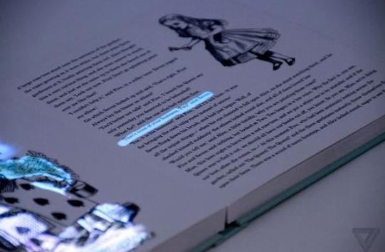 索尼給這個(gè)交互桌面編寫(xiě)了一套程序,讓能夠感知英國(guó)作家路易斯·卡羅爾(Lewis Carroll)的經(jīng)典著作《愛(ài)麗絲夢(mèng)游仙境》。在桌面的展覽原型上打開(kāi)書(shū)本時(shí),桌面就會(huì)出現(xiàn)相應(yīng)的動(dòng)畫(huà)。交互過(guò)程中,你可以移動(dòng)里面的物體,比如把碗和撲克牌拿出來(lái)玩等等。除此之外,這個(gè)桌面還可以追蹤手部方向,并響應(yīng)手部指壓動(dòng)作。